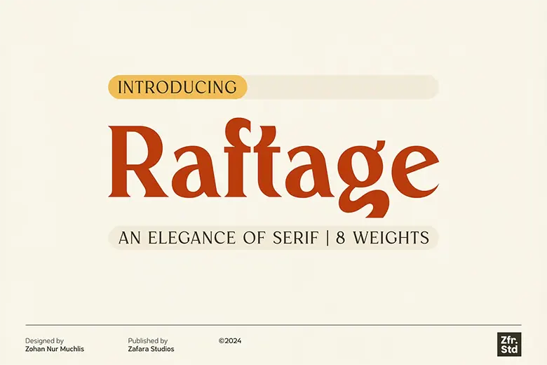 Raftage is a stylish serif font family known for its readability and classic design. It has subtle pointed tips for a sophisticated look. With eight weights available, Raftage works well for headlines, titles, body text, and brand elements.